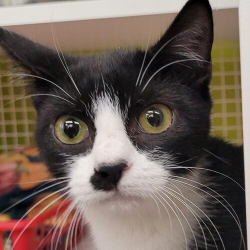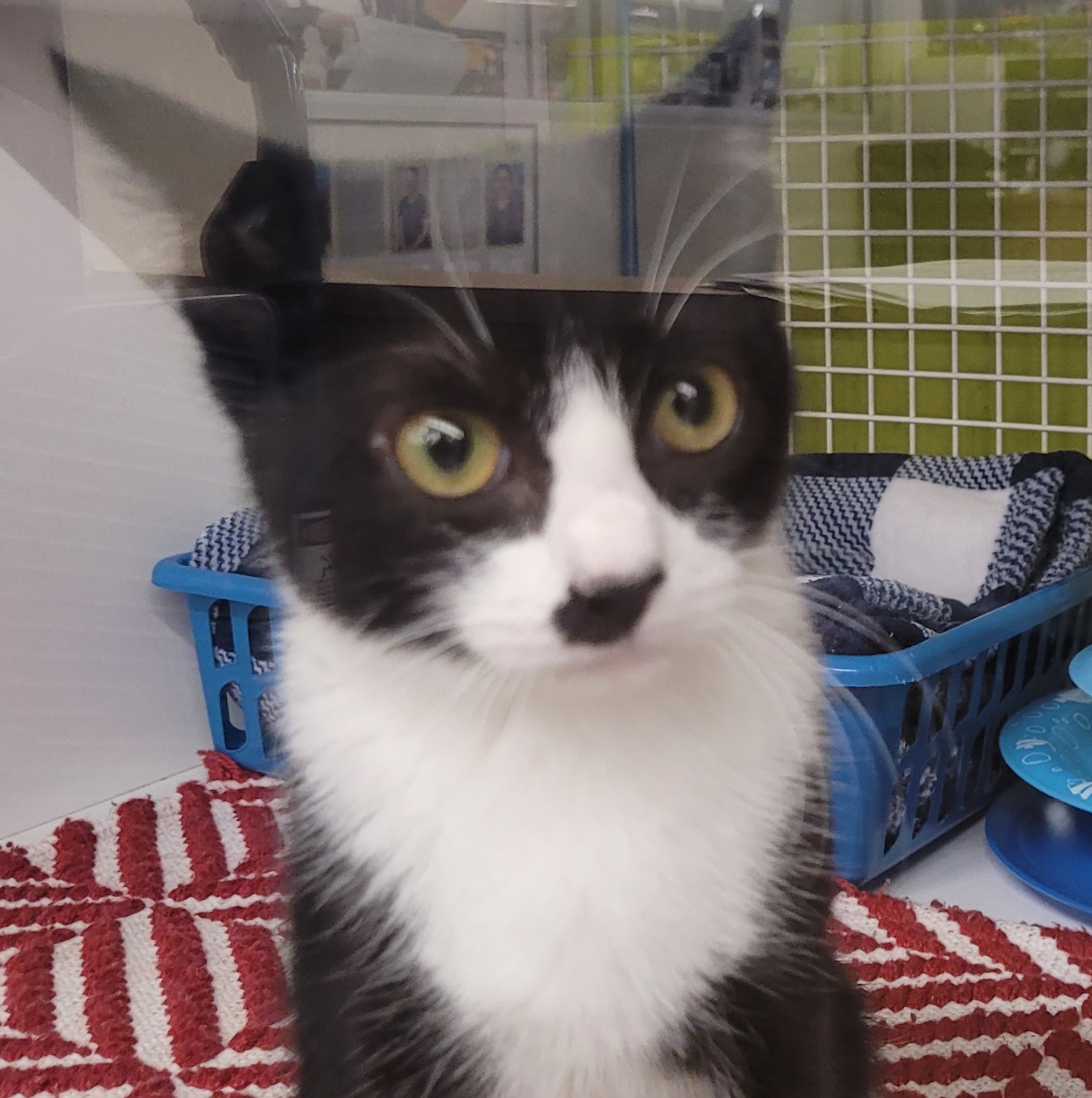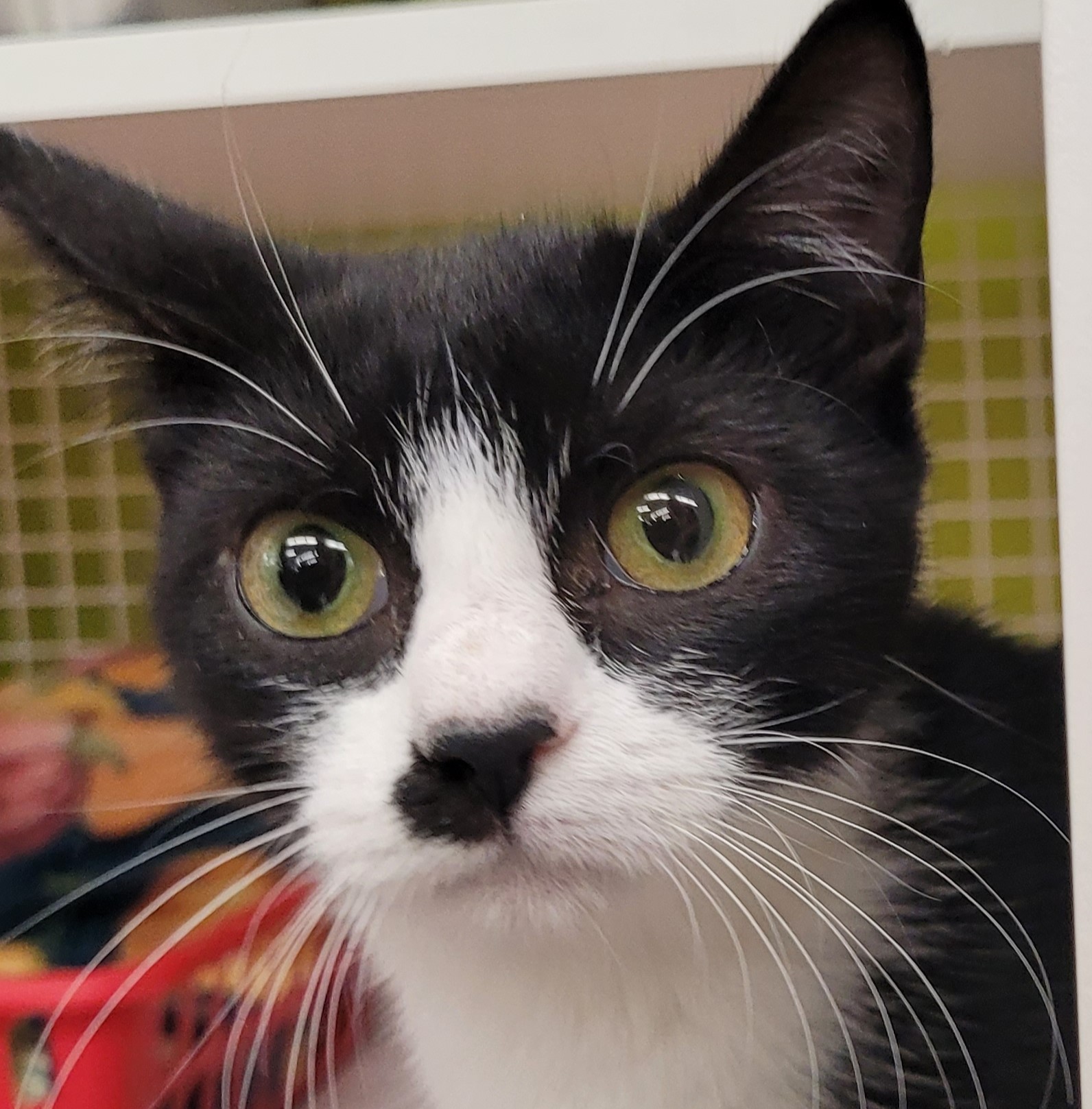 This adorable 5-month-old tuxedo kitten is ready to trade her scrubs for snuggles. As a former clinic cat at a busy vet office, Misses George is practically a professional when it comes to being loved. She is incredibly sweet, social, and isn't afraid to meet new people. When she's not charming everyone with her manners, she loves chasing wand toys and pouncing on anything that crinkles. She has the perfect balance of playful energy and affection. Bring this well-adjusted little lady home and get ready for a lifetime of purrs and fun!.
